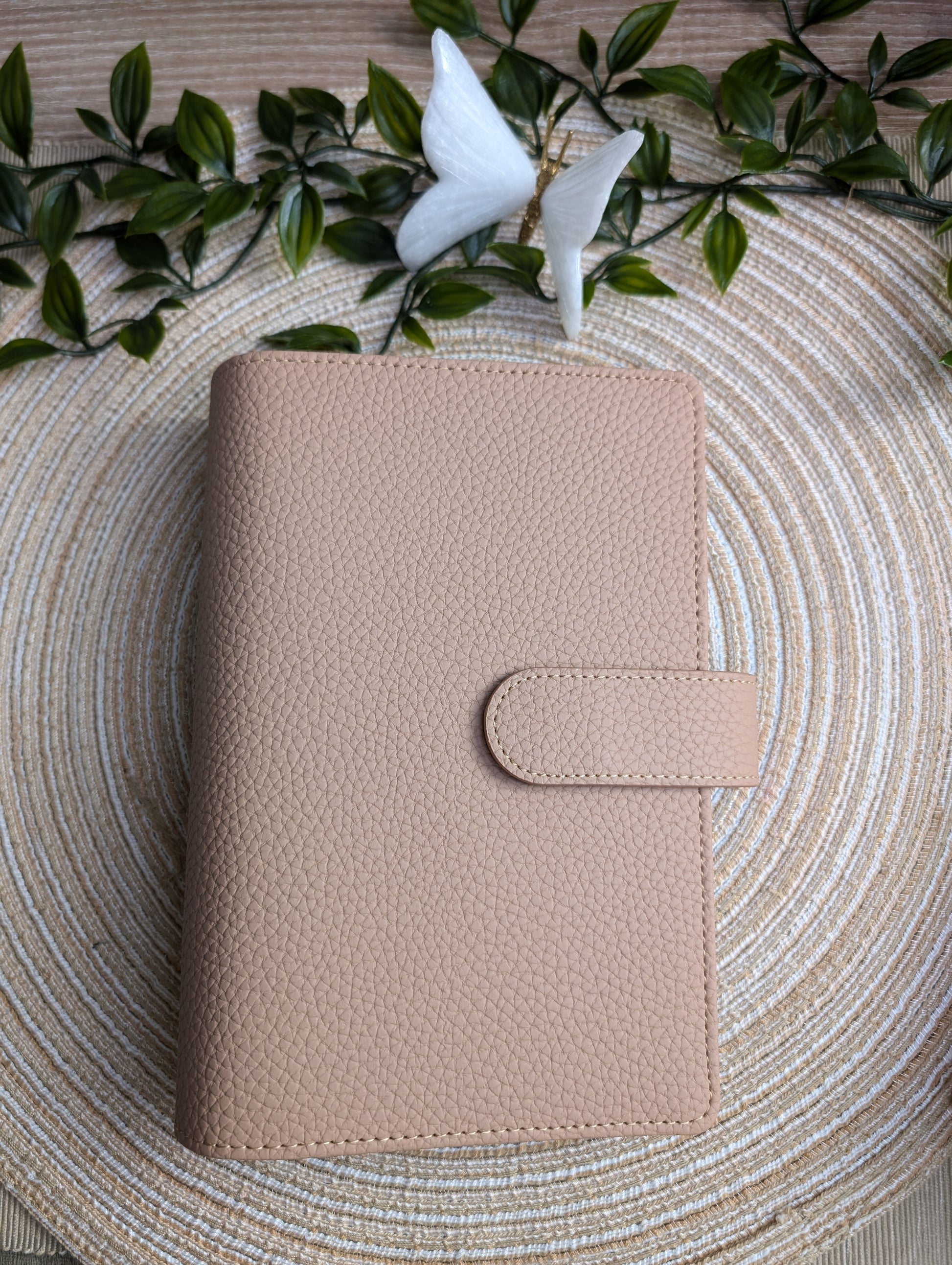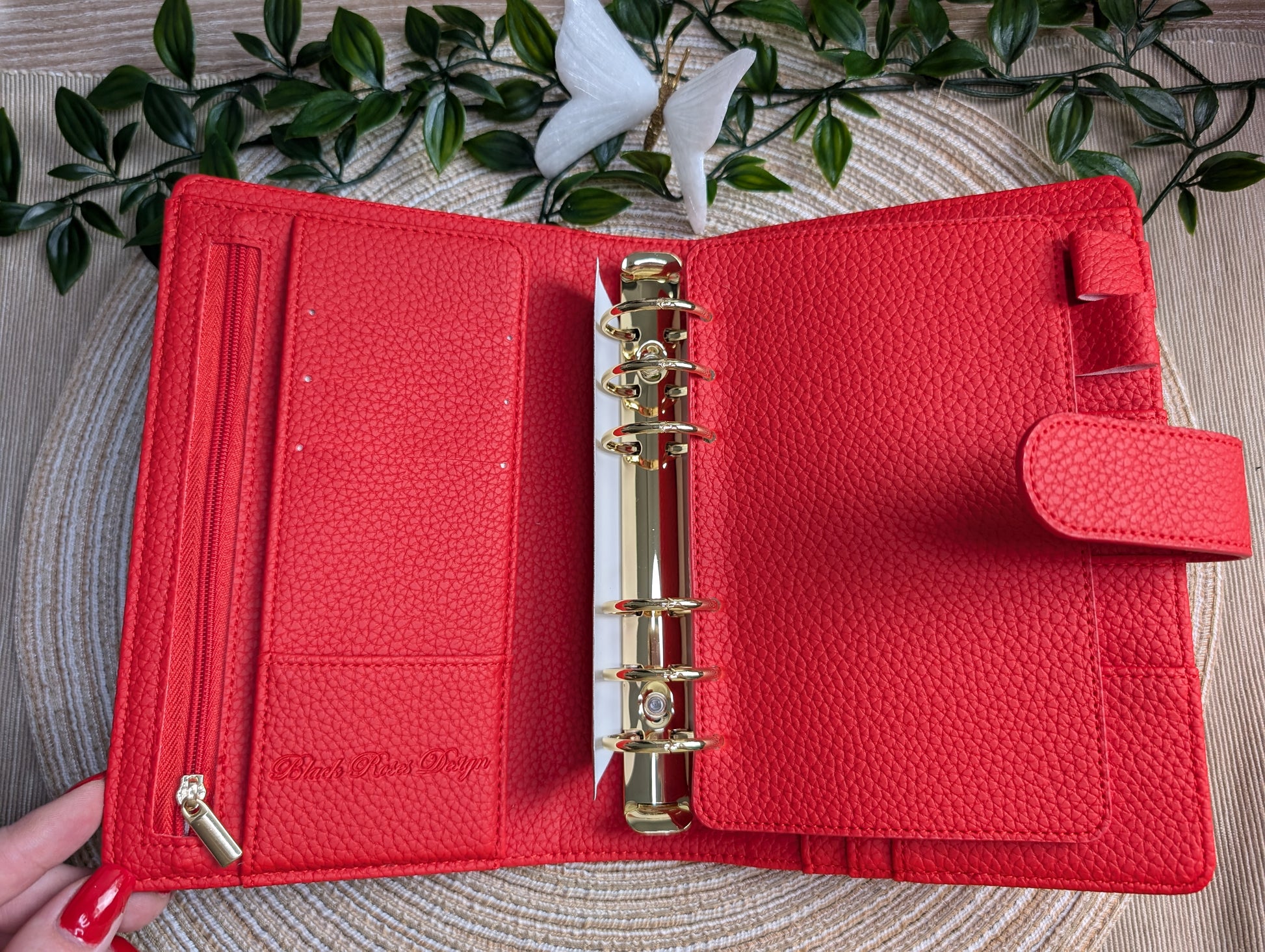 Die Größe A6 hat 6 große 35mm Ringe in Gold. Der Binder hat innen Kartenfächer, ein Reißverschluss für z.B. Kleingeld und eine extra Einlage für weiteren Platz. Zusätzlich habt ihr zwei Stifthalterungen. Er wird mit einem größenverstellbaren Magnet verschlossen.