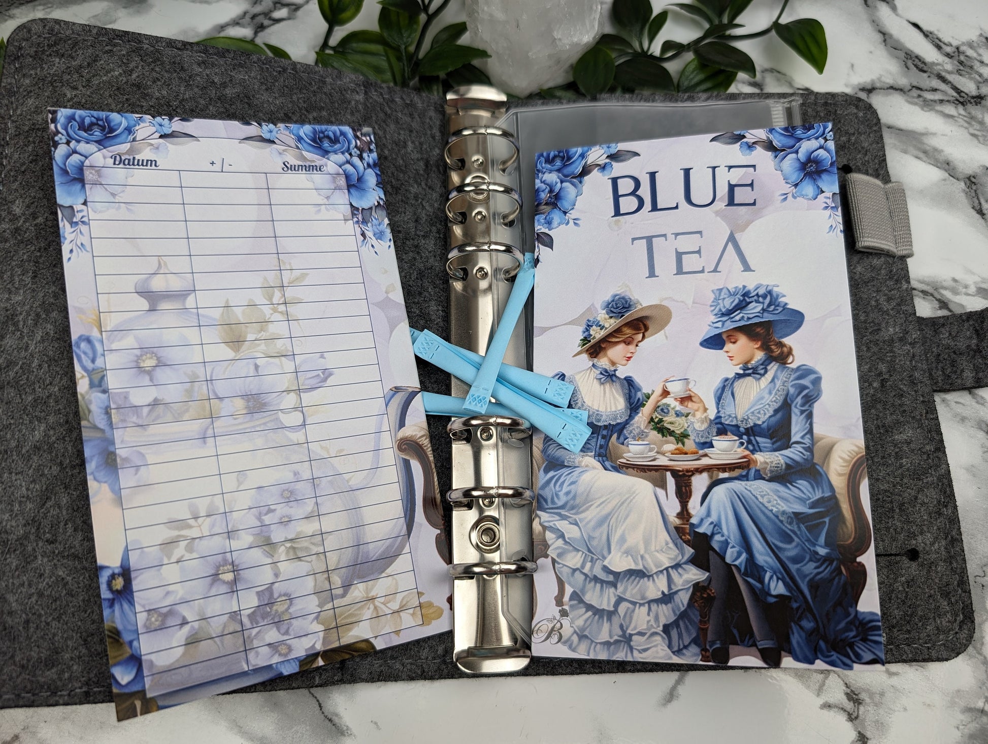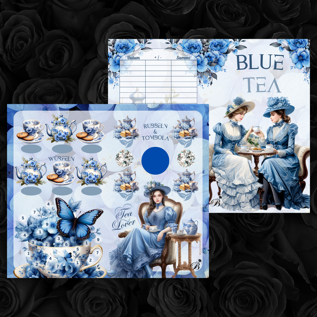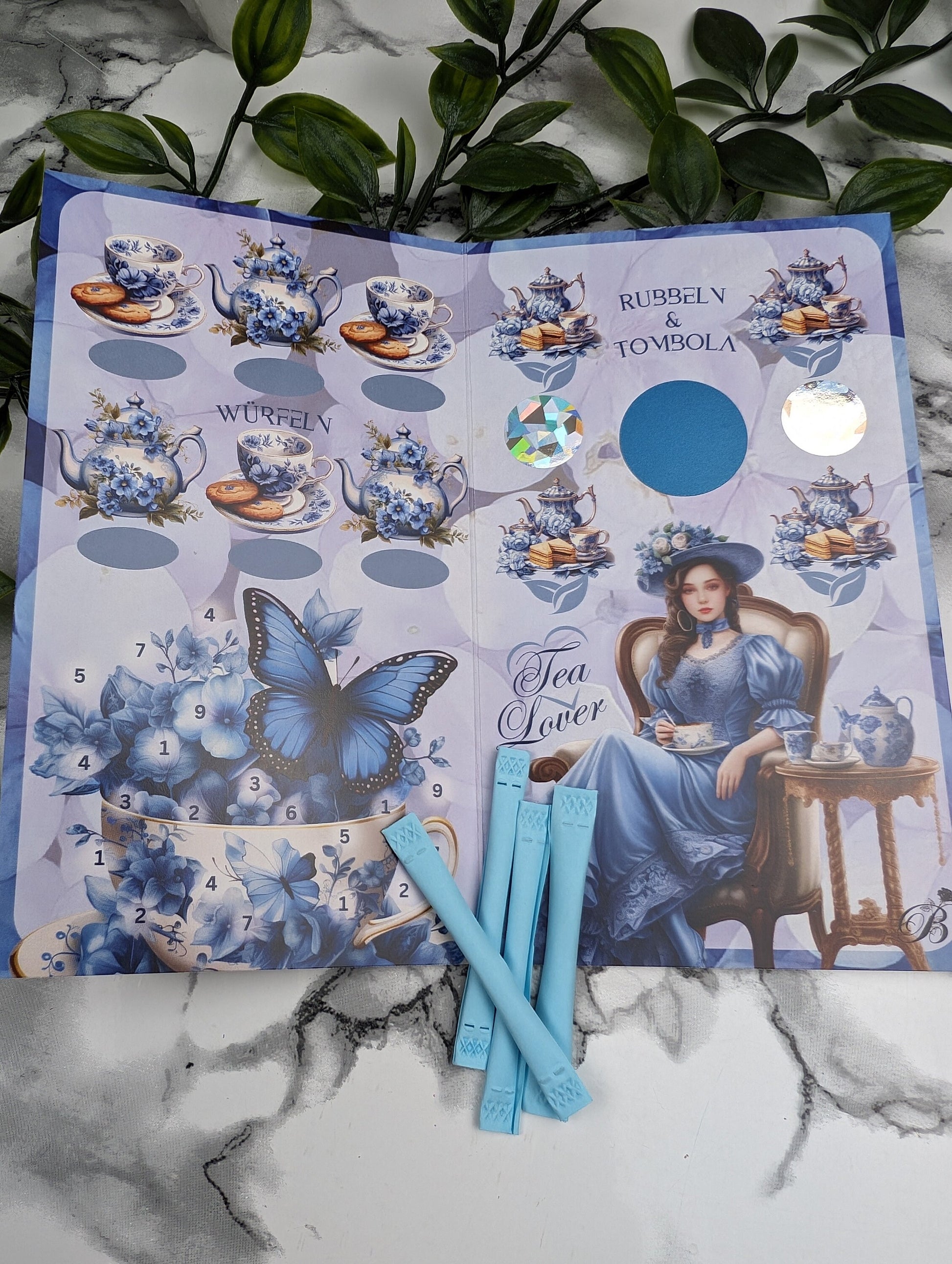 Blue Tea Klappkarte mit verschiedenen Sparmöglichkeiten. Ob zum Rubbeln, Würfeln oder Abhaken der Beträge, es ist alles mit dabei. Bei den Losen sparst du entweder den vollen Betrag oder die Quersumme.