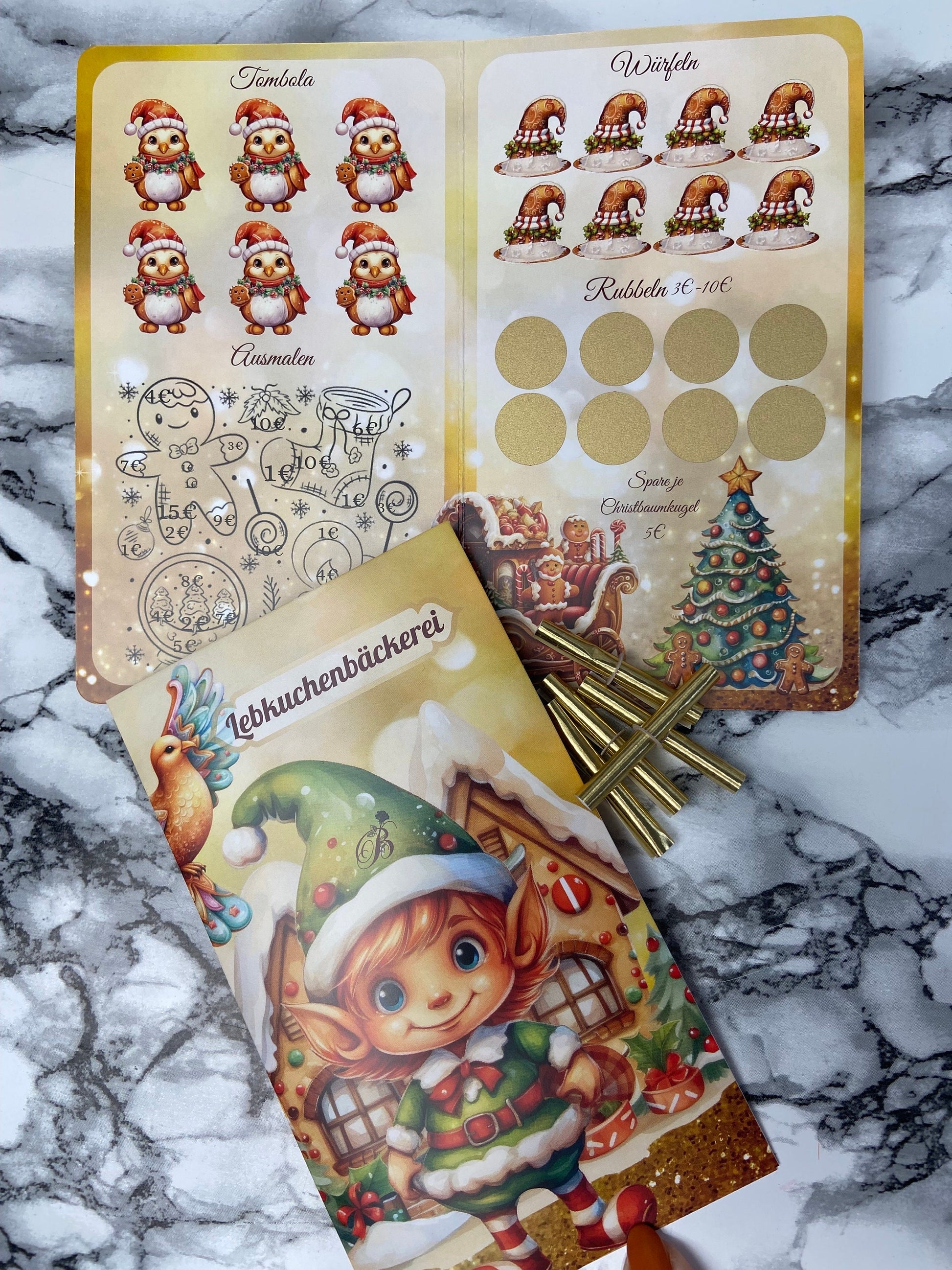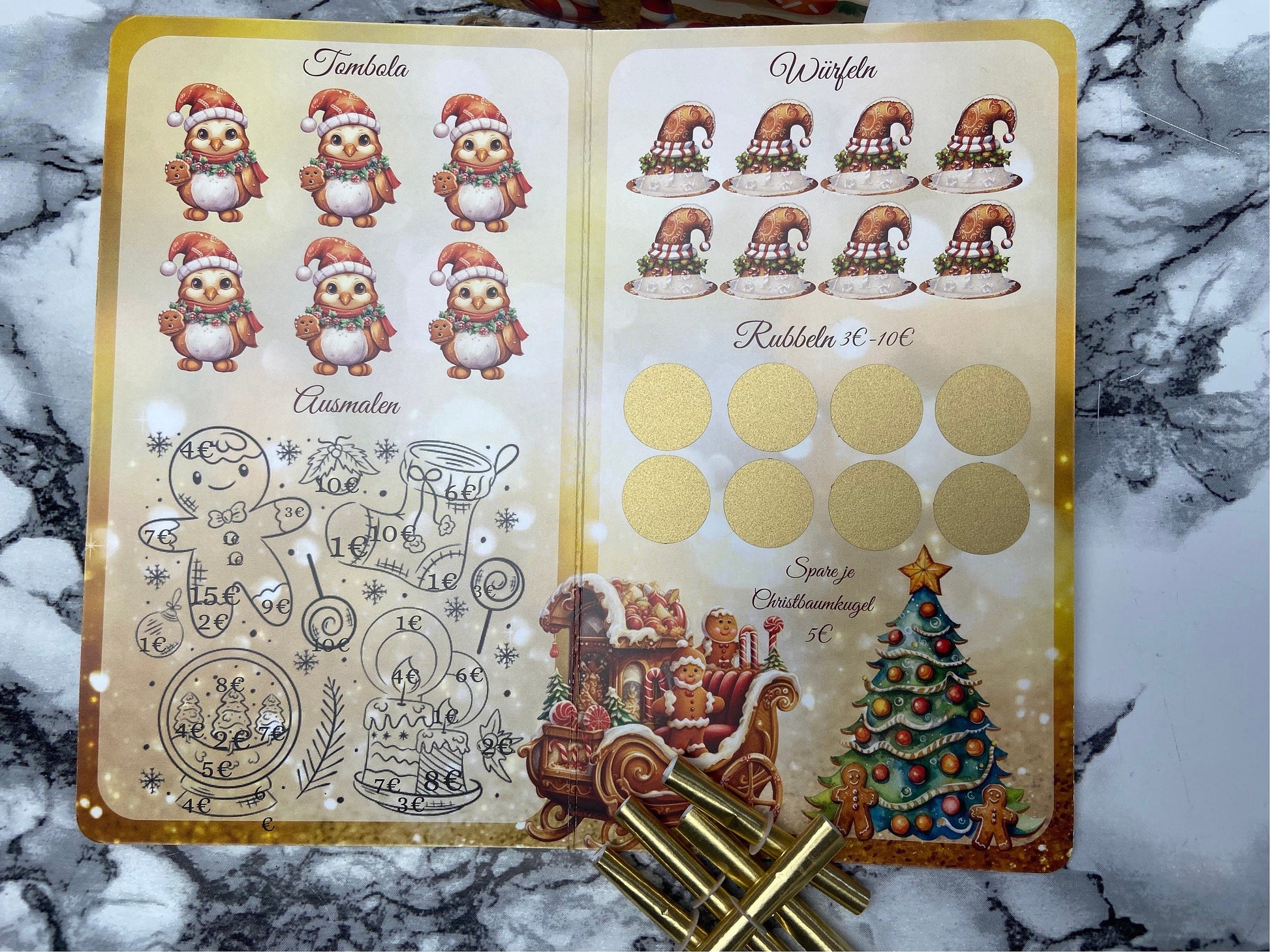 Klappkarte mit verschiedenen Sparmöglichkeiten. Ob zum Rubbeln, Würfeln oder Abhaken der Beträge, es ist alles mit dabei.